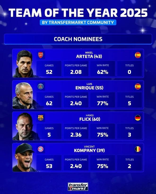 德转评年度最佳主帅:阿尔特塔、恩里克、弗里克、孔帕尼入围